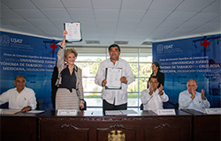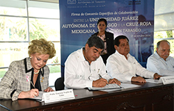 “Para la UJAT, es un compromiso coadyuvar con esta noble labor y consolidar la formación de profesionistas que tendrán en sus manos la responsabilidad de velar por la salud y el bienestar de los habitantes de la región”, señaló el rector Piña Gutiérrez tras la firma del acuerdo este lunes 17 de octubre en el vestíbulo del Centro Internacional de Vinculación y Enseñanza, donde se dieron cita damas voluntarias y personal de rescate de la Benemérita Cruz Roja Mexicana.