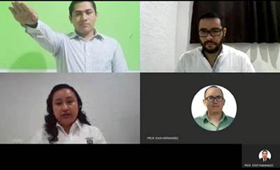 La ceremonia virtual realizada este lunes 27 de abril, congregó en línea a través de Microsoft Teams, a los profesores de la División Académica de Ingeniería y Arqui-tectura (DAIA), Karla María Aguilar Castro, Edgar Vicente Macías Melo e Iván Alejandro Hernández Pérez, quienes dieron lectura al acta de Toma de Protesta, al egresado de la Ingeniería Mecánica Eléctrica de esta casa de estudios.