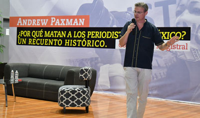 Acompañado por el profesor investigador, Roberto Carrera Ruíz, quien fungió como moderador del evento, Andrew Paxman recordó que desde el porfiriato ha persistido esta problemática, y en la actualidad según los datos que él mismo ha logrado recabar en una base de datos nutrida de varias fuentes, hoy México suma 304 casos, de los cuales 255 están relacionados con la actividad periodística.