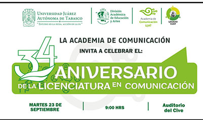 A través de la frecuencia 96.1 FM de Radio UJAT, Marín Villegas compartió que, la DAEA se encuentra próxima a celebrar el “34 Aniversario de la Licenciatura en Comunicación”, cuyo marco conmemorativo contará con la participación de docentes, estudiantes e invitados nacionales de dicha área.