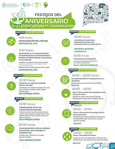 Finalmente, Marín Villegas invitó a estudiantes, egresados y aspirantes de la Comunicación, a participar en la inauguración de los festejos, cuya sede será el Centro Internacional de Vinculación y Enseñanza de la Zona de la Cultura, en punto de las 9:00 horas, del martes 23 de septiembre del presente año.