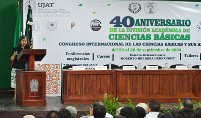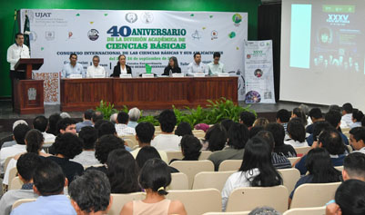 En presencia de la directora de la DACB, Hermicenda Pérez Vidal y la comunidad académica reunida en el auditorio “Ing. Adolfo Palavicini Álvarez” de la Unidad Chontalpa, en Cunduacán, Narváez Osorio, enfatizó que la UJAT seguirá impulsando la ciencia básica como fuente generadora de innovación y bienestar.