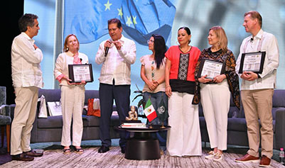 Destacó los esfuerzos europeos en la reducción de emisiones de gases de efecto invernadero y en la protección de la biodiversidad, al tiempo de aplaudir el liderazgo de México con la elección de su primera presidenta, enfatizando la importancia de seguir avanzando en la igualdad de género.