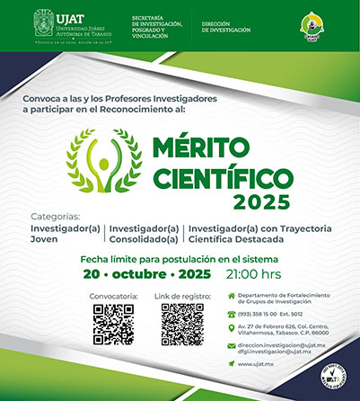 Con el objetivo de distinguir y galardonar el desempeño científico, la Universidad Juárez Autónoma de Tabasco (UJAT), a través de la Secretaría de Investigación, Posgrado y Vinculación, convoca a los profesores investigadores de las 12 divisiones académicas, a participar en el “Reconocimiento al Mérito Científico 2025”.