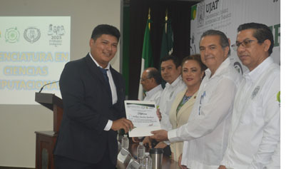 Durante la Ceremonia de Graduación, a la que asistió como representante del rector Guillermo Narváez Osorio, el secretario de Investigación, Posgrado y Vinculación de la UJAT, Wilfrido Miguel Contreras Sánchez, las autoridades universitarias entregaron los diplomas a los egresados de las licenciaturas en Actuaría, Ciencias Computacionales, Física, Ingeniería Geofísica, Matemáticas, Química y Químico Farmacéutico Biólogo.