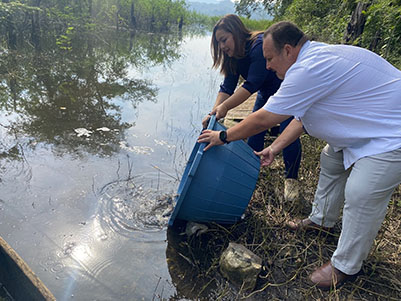 Durante esta actividad, el director de la División Académica Multidisciplinaria de los Ríos (DAMR), Arturo Magaña Contreras, acompañado por la presidenta municipal de Tenosique, Sandra Beatriz Hernández Jiménez, liberaron en la laguna de San Marcos, los ejemplares procedentes de los Laboratorios de Investigación de la UJAT.