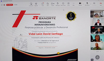 La Universidad Juárez Autónoma de Tabasco (UJAT) destacó a nivel nacional al obtener el primer, segundo y tercer lugar, además de dos menciones especiales, en el Programa Interuniversitario de Finanzas Públicas y Desarrollo Profesional, impulsado por Grupo Financiero Banorte, una iniciativa orientada a fortalecer la formación profesional de los jóvenes.