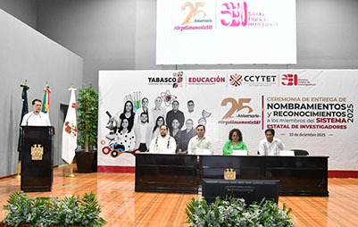 Durante la ceremonia de entrega de estímulos y reconocimientos del Sistema Estatal de Investigadores (SEI) 2025, el director del Consejo de Ciencia y Tecnología del Estado de Tabasco (CCYTET), Felipe de Jesús Sánchez Arias, destacó el papel de la Universidad Juárez Autónoma de Tabasco (UJAT) en el fortalecimiento del ecosistema científico estatal, reflejado en un crecimiento histórico que supera los mil integrantes registrados en el SEI.