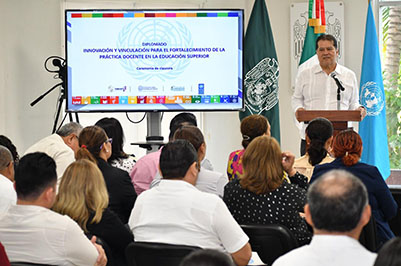 En este marco, se llevó a cabo la clausura del Diplomado “Innovación y vinculación para el fortalecimiento de la práctica docente en la educación superior”, desarrollado en colaboración con el PNUD y el Gobierno del Estado, celebrada en el Aula Magna “Dr. Efraín Pérez Cruz” de la División Académica de Educación y Artes (DAEA), con la presencia de autoridades universitarias, representantes del sector educativo y de organismos internacionales.