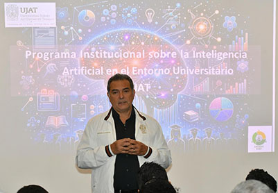 Durante su exposición, Contreras Sánchez presentó los ejes centrales del Programa Institucional sobre la Inteligencia Artificial en el Entorno Universitario, que contempla objetivos, alcances y niveles de implementación, así como su alineación con el Modelo Educativo de la UJAT; al tiempo que subrayó la definición de actores, fases e indicadores que permitan evaluar su impacto real en la comunidad universitaria.