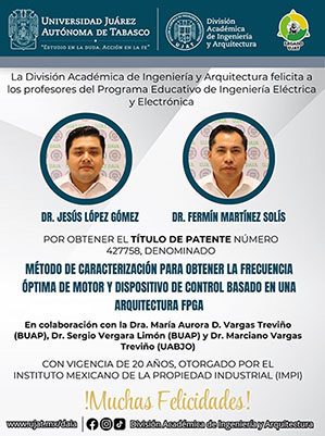 Resultado de un proyecto colaborativo desarrollado durante más de una década, los profesores investigadores de la División Académica de Ingeniería y Arquitectura (DAIA) de la Universidad Juárez Autónoma de Tabasco (UJAT), Jesús López Gómez y Fermín Martínez Solís, obtuvieron el título de patente número 427758, otorgado por el Instituto Mexicano de la Propiedad Industrial (IMPI), con vigencia de 20 años.