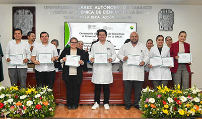 La Universidad Juárez Autónoma de Tabasco (UJAT), marca el rumbo en materia de Inteligencia Artificial (IA), Tecnologías Inmersivas, así como los conocimientos que fortalecen la atención primaria en el sector salud, aseguró el rector Guillermo Narváez Osorio, durante la entrega de constancias a 110 instructores y docentes egresados de los programas de diplomados impartidos en la División Académica de Ciencias de la Salud (DACS).