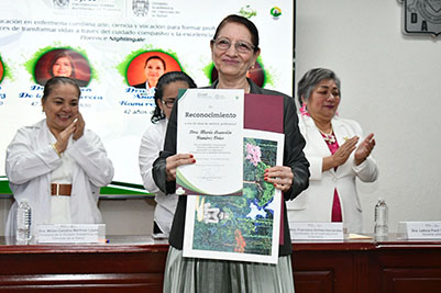 En este marco, se entregaron reconocimientos a la Doctora Leticia Fócil González, por 50 años de servicio; a la Doctora Carmen de la Cruz García, con 47 años; a la Doctora María Asunción Ramírez Frías, con 42 años de trayectoria, y a la Maestra Emma Pimienta Trinidad, por 27 años de labor académica, quienes dedicaron su vida a la formación de generaciones de enfermeras y enfermeros.