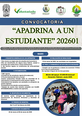 Para reforzar la permanencia escolar y fortalecer la equidad educativa, el Voluntariado de la Universidad Juárez Autónoma de Tabasco (UJAT), publicó dos convocatorias del programa de becas “Apadrina a un Estudiante”, correspondientes al periodo febrero–junio 2026, dirigidas a alumnos de licenciatura en situación de vulnerabilidad.