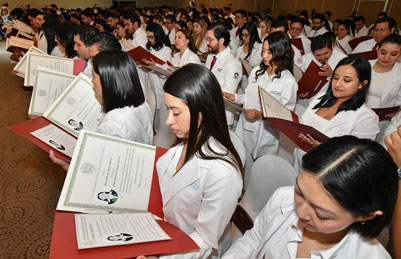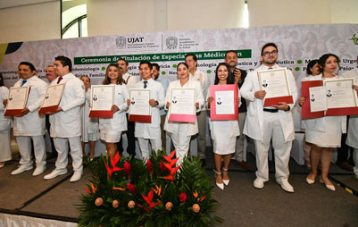 Durante la ceremonia de titulación, realizada en el Salón Bugambilia del Hotel Marriott, el rector de la UJAT, acompañado por el representante del gobernador del estado, Javier May Rodríguez, el subsecretario de Gobierno, José Pablo Mora Gómez; la directora de la División Académica de Ciencias de la Salud (DACS), Miriam Carolina Martínez López, y el secretario de Salud del estado, Alejandro Antonio Calderón Alipi, hizo entrega de los títulos a especialistas en Anestesiología, Cirugía General y Epidemiología.