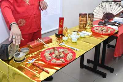 Además de la decoración, los estudiantes participaron en charlas sobre costumbres, regalos, gastronomía y normas sociales propias del Año Nuevo Chino. En el salón, el profesor organizó una muestra de juegos de té, degustación de té negro y preparación de ravioles chinos, alimento típico de esta festividad.