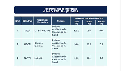 El Centro Nacional de Evaluación para la Educación Superior (CENEVAL) reconoció a las licenciaturas en Médico Cirujano, Cirujano Dentista y Nutrición de la División Académica de Ciencias de la Salud de la UJAT, al incorporarlas al Padrón de Programas de Alto Rendimiento Académico EGEL Plus, tras los resultados obtenidos en el Examen General para el Egreso de la Licenciatura (EGEL) 2023–2025.