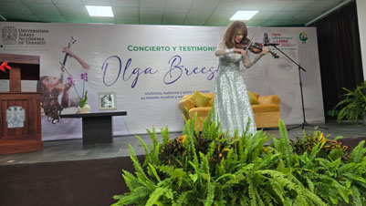 La música llegó con la presentación de la actriz y violinista Olga Breeskin, quien ofreció un concierto en el Auditorio “Ing. Adolfo Palavicini Álvarez” de la Unidad Chontalpa, creando un ambiente cercano y emotivo con los asistentes.