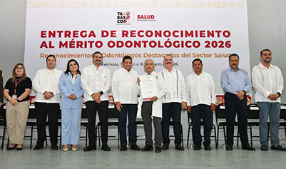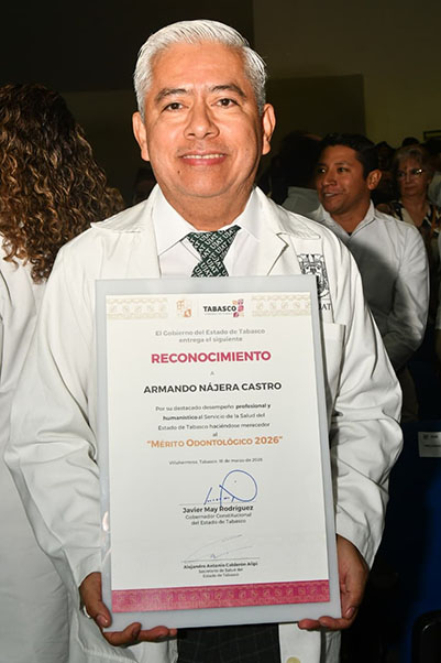 El gobernador, Javier May Rodríguez, entregó el Mérito Odontológico 2026, al cirujano dentista Armando Nájera Castro, egresado de la Universidad Juárez Autónoma de Tabasco (UJAT), así como reconocimientos a 22 odontólogos destacados del sector salud.