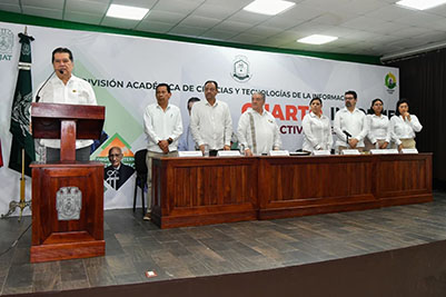 Como parte de la ceremonia realizada en el Auditorio, “Ing. Adolfo Palavicini Alvarez”, en la que estuvieron presentes autoridades universitarias, profesores y estudiantes, el director de la DACYTI, realizó la entrega de la versión impresa del Cuarto Informe, al rector de la UJAT, Guillermo Narváez Osorio y la presidenta de la H. Junta de Gobierno, Rocío del Carmen Hernández Hernández.