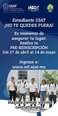 La Universidad Juárez Autónoma de Tabasco (UJAT), a través de la Dirección de Servicios Escolares, exhortó a los estudiantes de nivel Licenciatura, a llevar a cabo el proceso de pre-reinscripción correspondiente al próximo ciclo académico, con el propósito de asegurar su continuidad escolar sin contratiempos.
